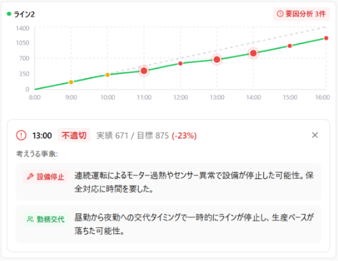 ビットクォーク株式会社が提供する「recosee(リコシー)」は、生産実績や在庫量に加え、「どの工程で」「いつ」「どのような事象が発生したのか」といった工程上の出来事を工程単位で整理・可視化します。さらに、AIを活用して計画との差異や時間当たり出来高が変化した要因を推定することで、現場での要因推定の切り口を提案します。これらの機能は、例えば、製造現場の大型モニター上に常時表示することで、関係者が同じ指標・同じ画面を見ながら現状把握を行い、次の行動を判断しやすい環境づくりを支援します。